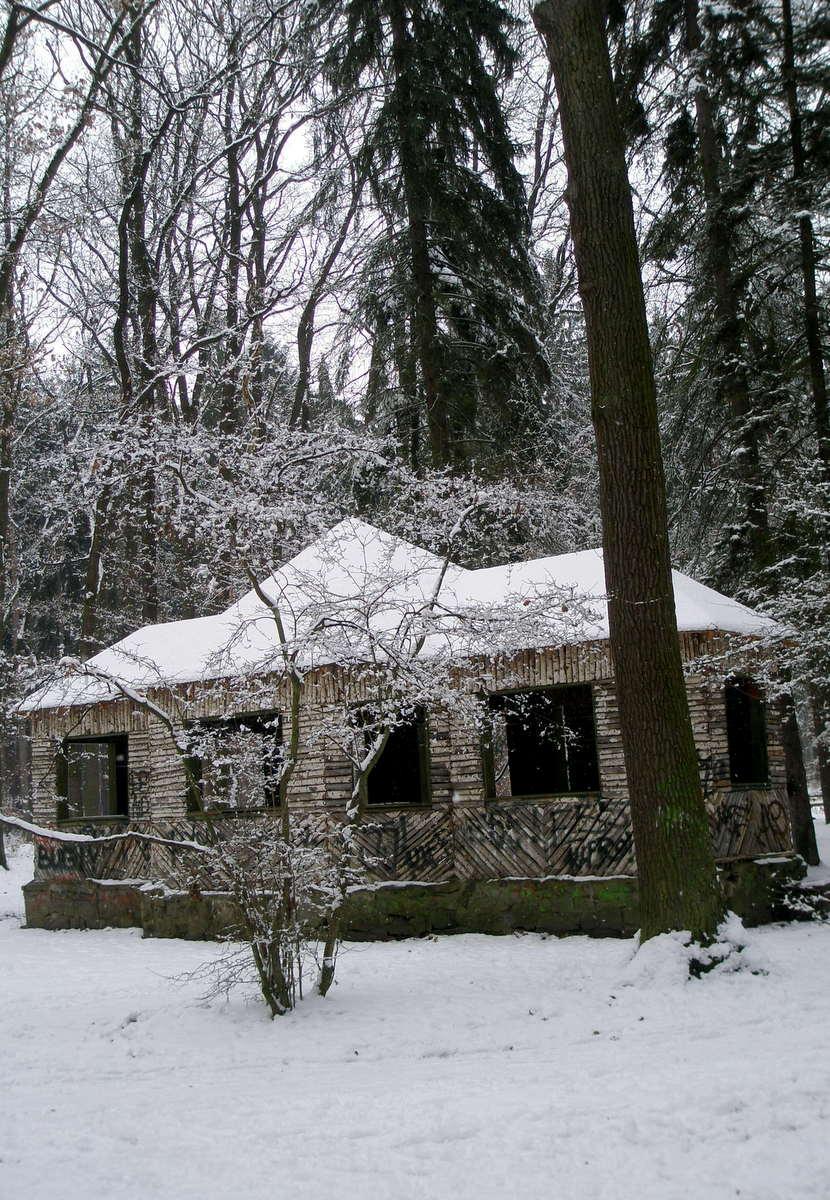 dřevěnou chaloupku v lese