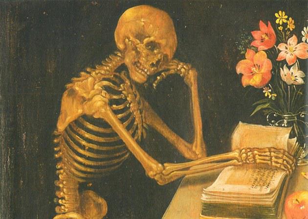 Zadumaná kostra nad vlastní knihou