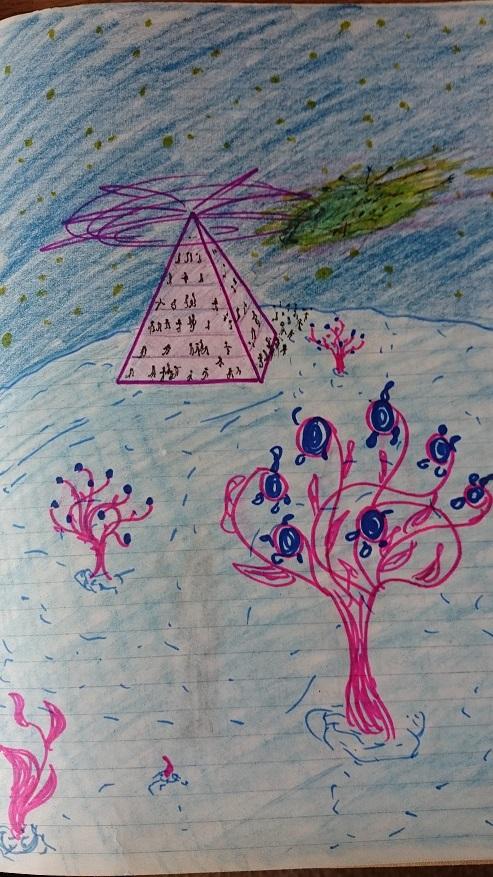 Náhle byla tma, strhla si tedy skafandr a jen stěnami mírně zkosenými (snad to bylo někde uprostřed jehlanu) byla nádherně vidět jasná hvězdná obloha, kde se objevily stíny těles všech tvarů, ohraničené barevnými body, přesně tak, jak říkala „tenkrát“ Helena. Všichni se rozběhli ke stěnám a přihlíželi té nádheře kvádrů, krychlí, kuželů, jehlanů, trojúhelníkových tvarů i lichoběžníkových, letících tou černou hvězdnou oblohou. Byla to tak ohromná tělesa, že i když letěla v nesmírné výšce, působila mohutně.