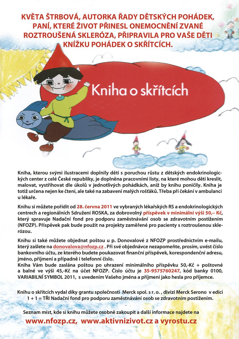 » autorka: Květka Š. (Květa Štrbová) ![]() Knížka vyšla s obrázky dětí s poruchami růstu. Byla vydaná za pomoci nadačního fondu. Kniha, kterou svými ilustracemi doplnily děti s poruchou růstu z dětských endokrinologických center z celé České republiky, je doplněna pracovními listy, na které mohou děti kreslit, malovat, vystřihovat dle úkolů v jednotlivých pohádkách, aniž by knihu poničily. Kniha je totiž určena nejen ke čtení, ale také na zabavení malých rošťáků. Třeba při čekání v ambulanci vašeho lékaře. Detail knihy na NFOZP.cz (Nadační fond pro podporu zaměstnávání osob se zdravotním postižením). |